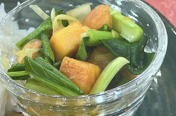 小松菜、柿、たまねぎ、レモン汁、カレー粉、塩