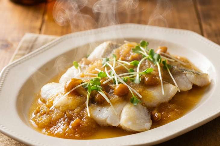 旬の白身魚をこんがりと焼いて、なめこと大根おろしのあんかけをかけました。