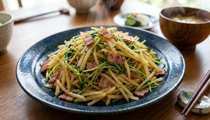 カリカリに炒めた薄切りのベーコン、せん切りにしたじゃがいも、豆苗の3つの材料を炒めて、酢・砂糖・しょうゆ・塩で味付けした一品です。