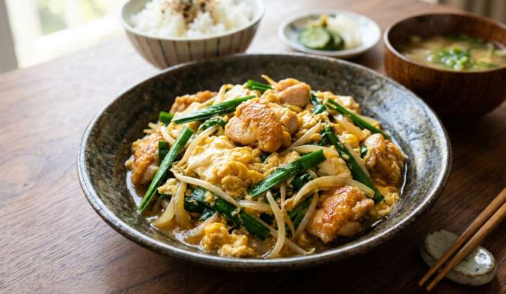 鶏モモ肉、ニラ、卵、玉ねぎ、塩、片栗粉、サラダ油、もやし、絹ごし豆腐、砂糖、みそ、酒、みりん、しょうゆ、一味唐辛子