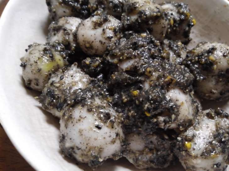 里芋にほうれんそうとしめじを合わせ、黒ごまの香りがきいたあえものです。