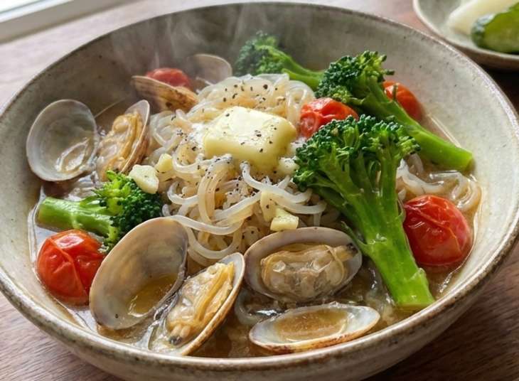 あさりにブロッコリー、しらたきと具沢山!