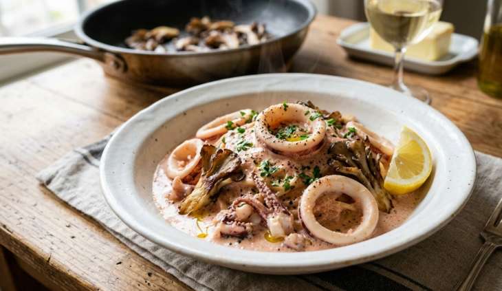 イカ、マイタケ、タラコ、塩、オリーブオイル、白ワイン、生クリーム、バター、コショウ、オリーブオイル、レモン