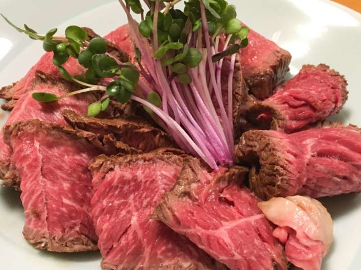 牛ももステーキ肉をフライパンで簡単にローストビーフ風に仕上げます。