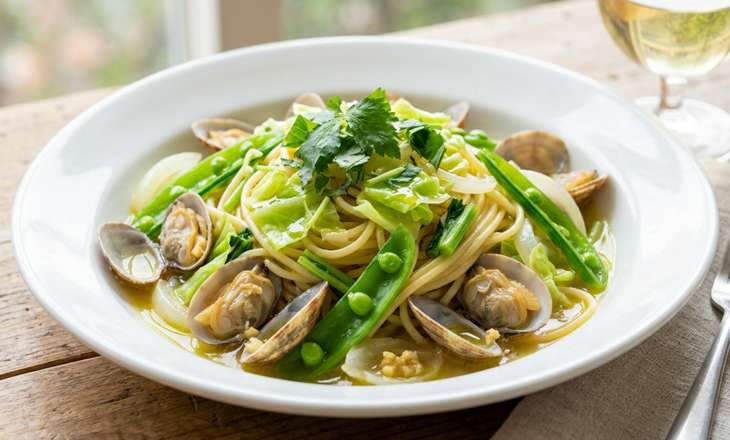 スパゲティ、アサリ、春キャベツ、新タマネギ、スナップエンドウ、みつば、塩、オリーブオイル、ショウガ、白ワイン