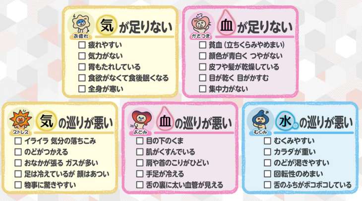 先ほどの体質タイプは、この「気・血・水」のどれかが足りなかったり、巡りが悪かったりしているのかを判別しています。