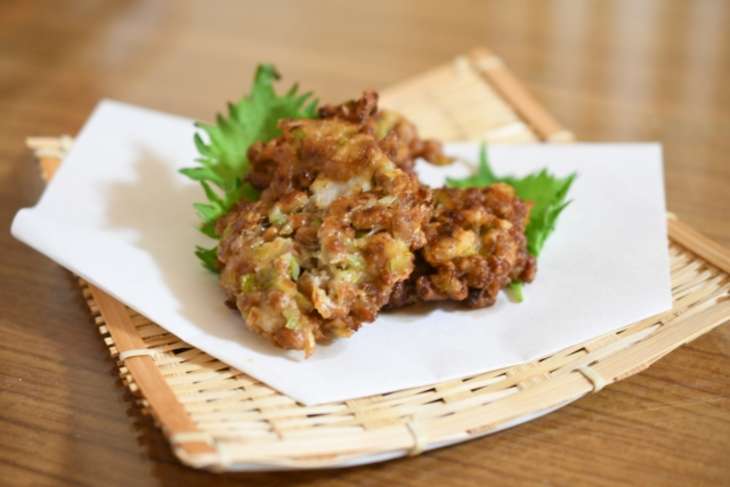 - 大豆に片栗粉をまぶし、180度の油で揚げる。