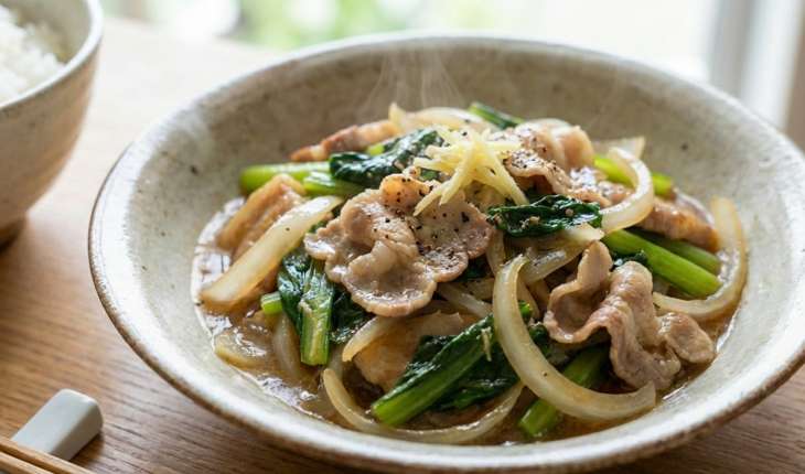 豚バラ薄切り肉、小松菜、ショウガ、玉ねぎ、サラダ油、塩、粗びき黒コショウ、水、酒、昆布、しょうゆ、砂糖、片栗粉、水