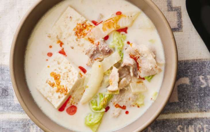 | 豚バラ薄切り肉 | 80g | 白菜 | 1/8個(正味180g) | 絹ごし豆腐 | 1/2丁 | 牛乳 | 200cc | 塩、コショウ | 各適量 | ラー油(好みで) | 適量 |