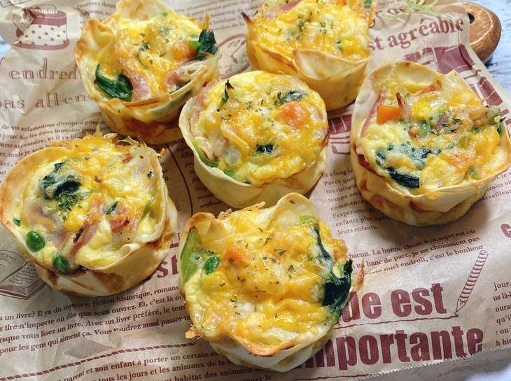 餃子の皮を使った彩り豊かなおかずです。お好きな具材を入れてオーブンで焼くだけ!食欲そそる絶品メニューに仕上げます